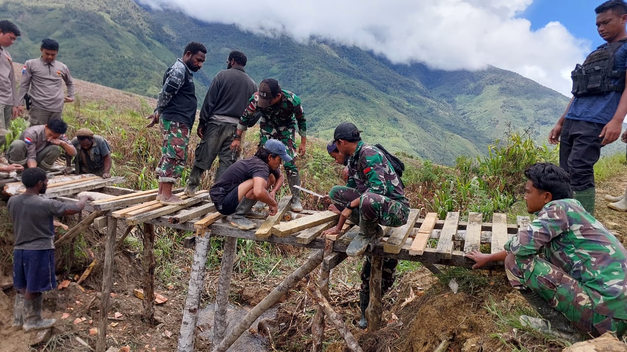 KeizalinNews Pegunungan Bintang -Satgas Yonif 143/TWEJ mengajak warga untuk membangun jembatan penghubung antara Kampung Mangoldoki dan Sopamikma yang telah hancur di Distrik Kiwirok, Kab. Pegunungan Bintang, Papua, Senin (20/02/2023).