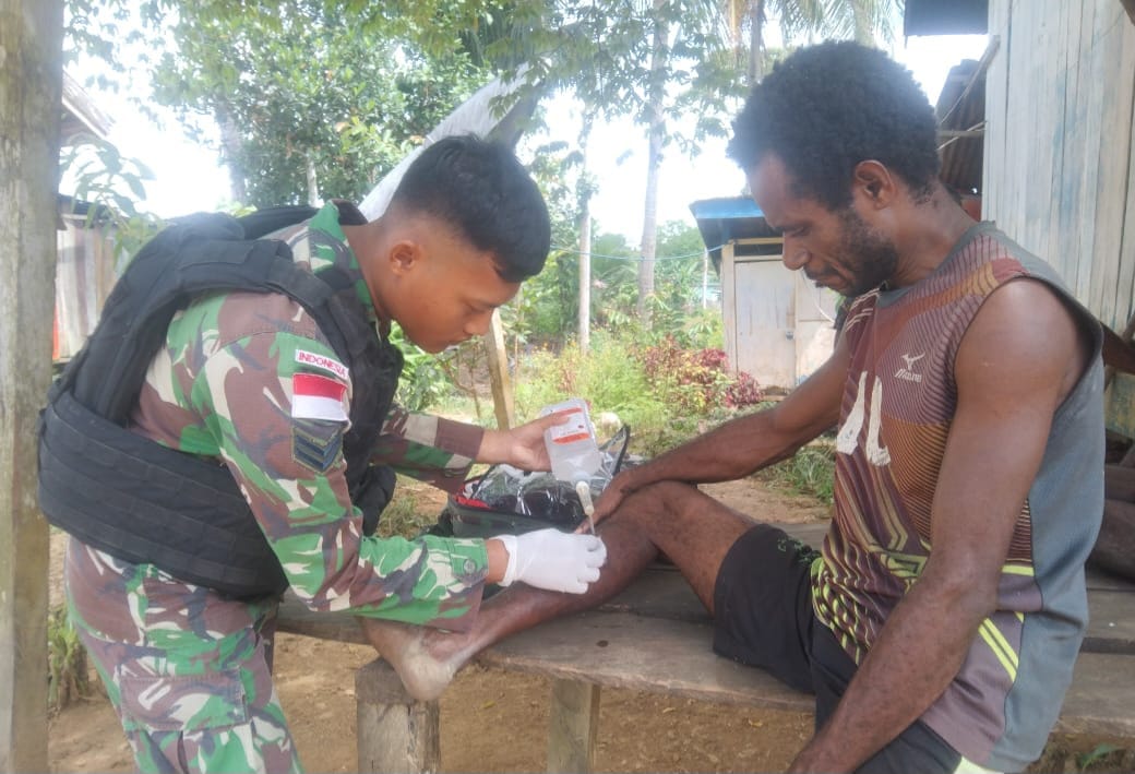 KeizalinNews Keerom -Kepedulian Satgas Yonif 143/TWEJ dalam menjaga dan meningkatkan kesehatan di perbatasan RI-PNG intens melaksanakan pengobatan sekaligus memberikan pemahanan tentang cara hidup sehat kepada masyarakat di Kampung Yabanda, Distrik Yaffi, Kab. Keerom, Papua, Kamis (23/02/2023).