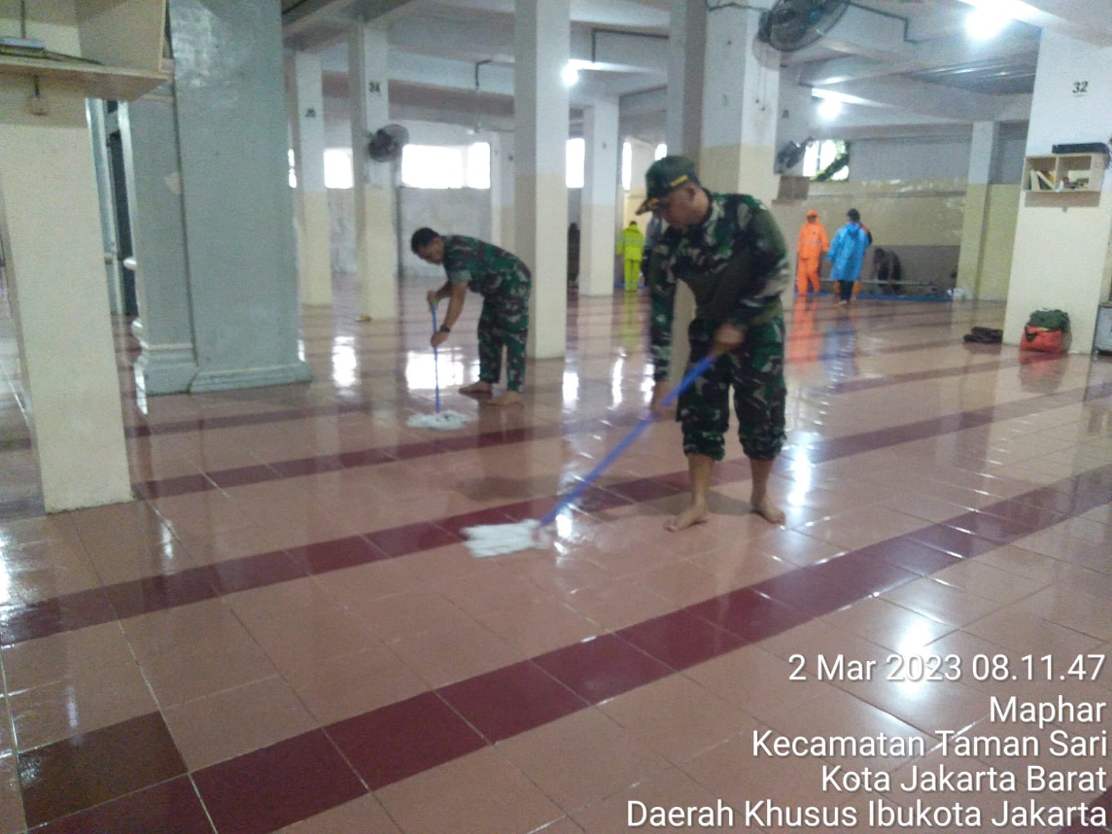 “Kegiatan karya bakti yang kami laksanakan di sasarkan tempat Ibadah, yakni Mesjid Jami Kebun Jeruk Jalan Mesjid RT. 08/05 dan Mesjid Jami Annur Jalan Tamansari 2, RT.06/03, Kel Maphar.”Ucap Peltu Anton.