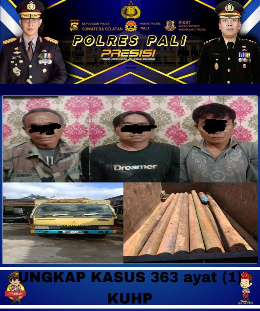 “Pada saat dilakukan pengejaran di dapati mobil tersebut di Desa Modong Kec. Sungai Rotan Kabupaten Muara Enim dan di temukan barang bukti pipa besi sebanyak 17 batang dengan ukuran 6 inci dan panjang 4 meter, sehingga di bawa menuju ke pos security Adera dan selanjutnya tersangka berikut Barang bukti diserahkan ke Mapolsek Tanah Abang,’ tutupnya Kapolsek Tanah Abang mewakili Kapolres PALI.
