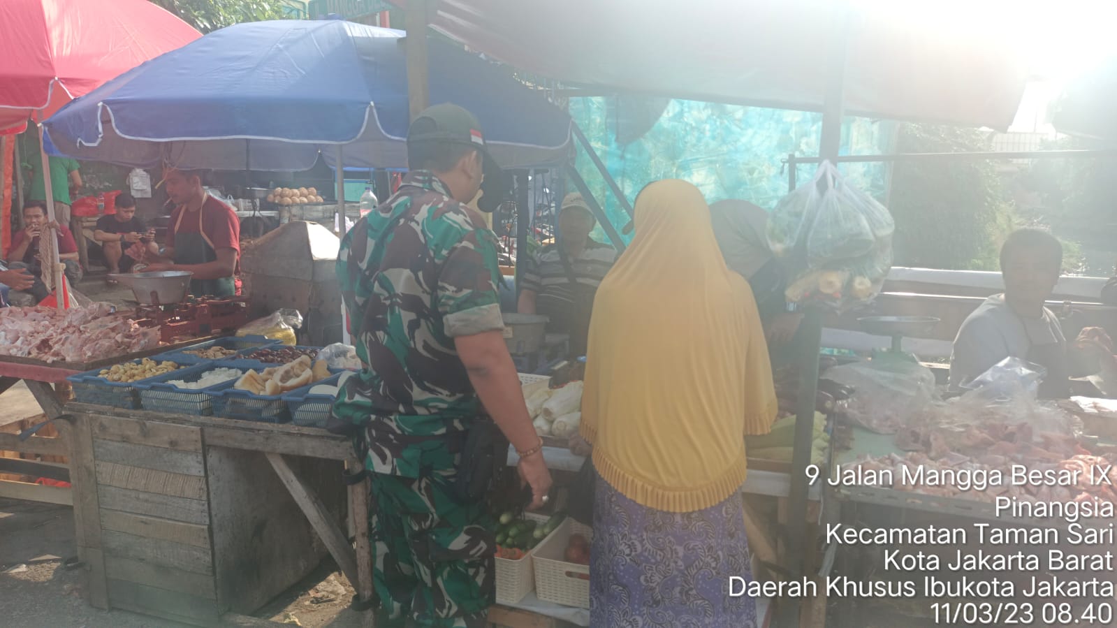 KeizalinNews Kodam Jaya, Kodim 0503/JB – Peesonil Koramil 01/Tamansari, Serda Aprianto kembali melaksanakan pemantauan perkembangan harga sembako di Pasar Pecah Kulit Jalan Mangga Besar IX, Rt. 007/001, Kel. Pinangsia Kec. Tamansari Jakarta. Sabtu (11/03/2023).