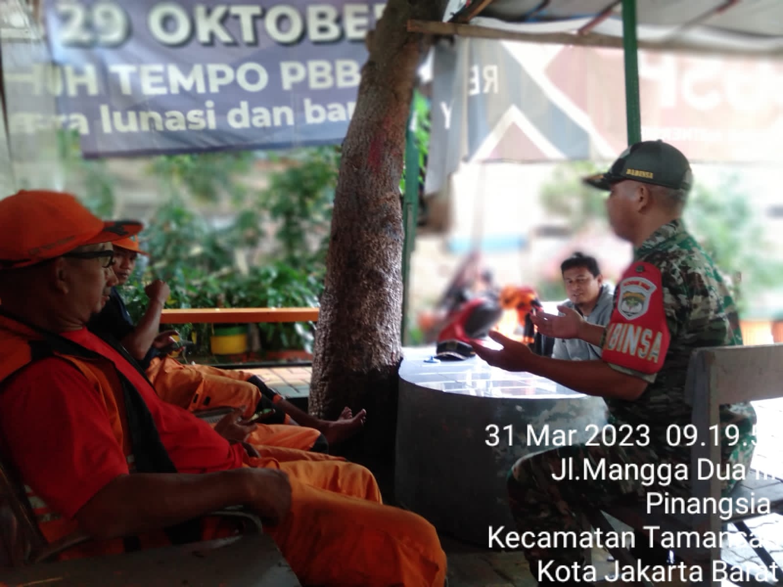 KeizalinNews Kodam Jaya, Kodim 0503/JB – Babinsa Koramil 01/Tamansari Sersan Mayor (Serma) Wakdinator melaksanakan Komunikasi Sosial (Komsos) dengan petugas PPSU Kel.Pinangsia di Saung Kelurahan Pinangsia Jl.Mangga Dua III RT 05/03 Kel.Pinangsia Kec.Tamansari Jakarta Barat. Jum’at, 31 Maret 2023.