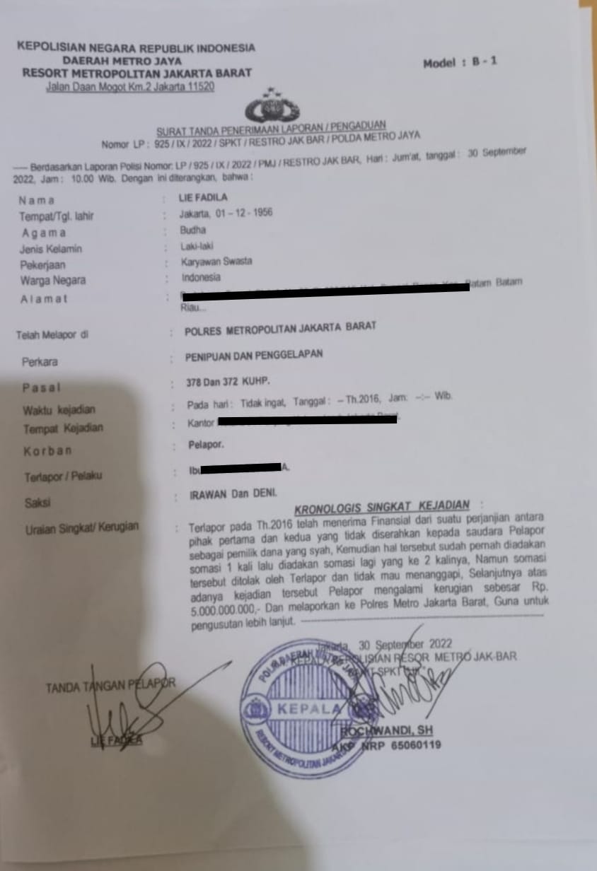 LM diduga telah melakukan penipuan dan penggelapan sebagaimana pasal 378 dan 372 KUHP, padahal Lie selaku pelapor telah membuat laporan dengan nomor laporan 925/IX/2022/SPKT/Restro Jakbar/Polda Metro Jaya.