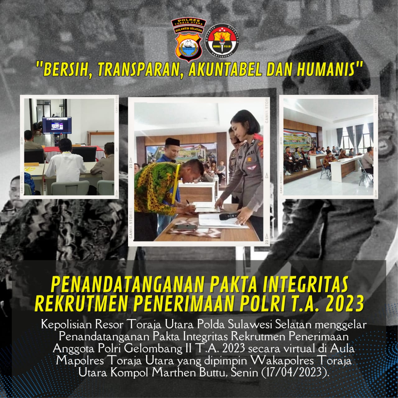 Saat dikonfirmasi, Kapolres Toraja Utara AKBP Zulanda, S.IK.,M.H melalui Wakapolres Toraja Utara Kompol Marthen Buttu, mengatakan Penandatanganan pakta integritas ini merupakan komitmen bersama unsur-unsur terkait sehingga penerimaan Polri dapat berjalan sesuai dengan prinsip Bersih, Transparan, Akuntabel dan Humanis (Betah).