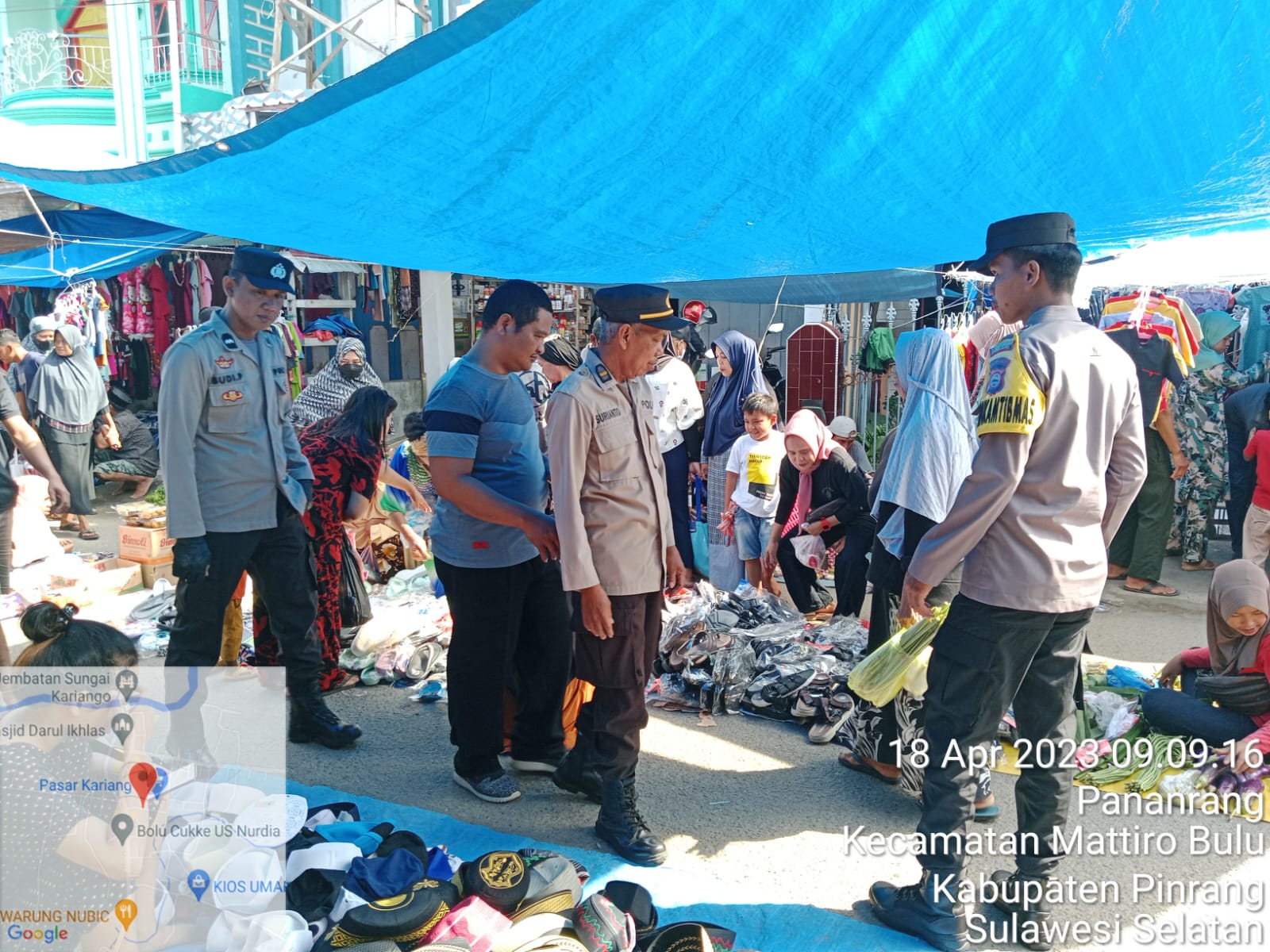 Kapolsek Mattiro Bulu, Iptu H. Sudirman bersama anggota melaksanakan giat patroli dan himbauan kamtibmas di Pasar Tradisional Kariango Kecamatan Mattiro Bulu, Kabupaten Pinrang Sulawesi Selatan.