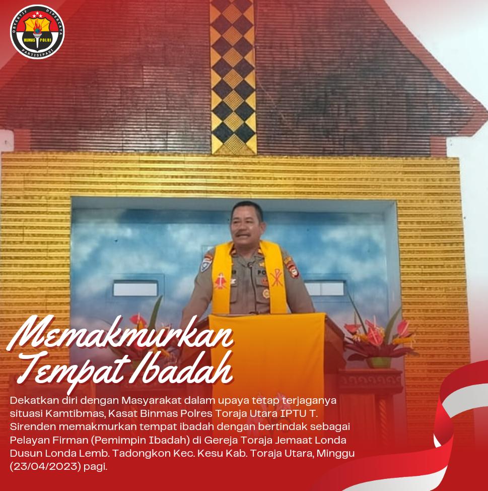 KeizalinNews.Com, Torut (Sulsel)–Dekatkan diri dengan Masyarakat dalam upaya tetap terjaganya situasi Kamtibmas, Kasat Binmas Polres Toraja Utara IPTU T. Sirenden memakmurkan tempat ibadah dengan bertindak sebagai Pelayan Firman (Pemimpin Ibadah) di Gereja.