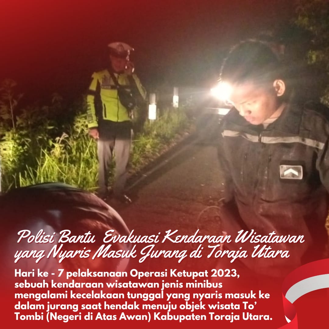 KeizalinNews.Com, Torut (Sulsel)–Hari ke – 7 pelaksanaan Operasi Ketupat 2023, sebuah kendaraan wisatawan jenis minibus mengalami kecelakaan tunggal yang nyaris masuk ke dalam jurang saat hendak menuju objek wisata To’ Tombi (Negeri di Atas Awan) Kabupaten Toraja Utara.