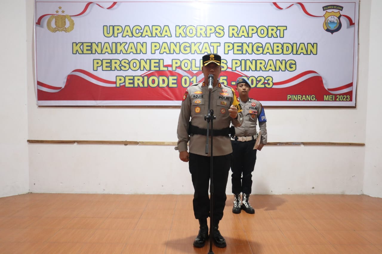 KeizalinNews.Com, Pinrang (Sulsel) – Kapolres Pinrang AKBP Santiaji Kartasasmita,S.I.K memimpin upacara Korps Raport kenaikan pangkat pengabdian setingkat lebih tinggi dari AKP menjadi KOMPOL diberikan kepada Baharuddin jabatan Kasat Binmas Polres Pinrang.