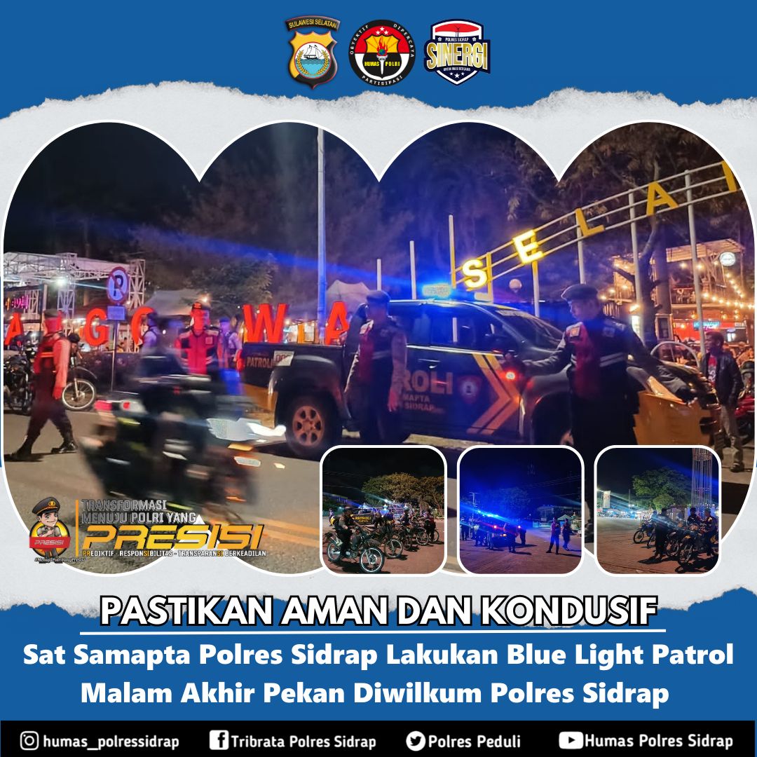 Kapolres Sidrap AKBP Erwin Syah, S.I.K melalui Kasat Samapta AKP Supiadi Ummareng mengatakan bahwa, Patroli Blue Light dilakukan di tempat- tempat keramaian, tempat rawan kejahatan serta kegiatan masyarakat yang ada di wilayah hukum Polres Sidrap.