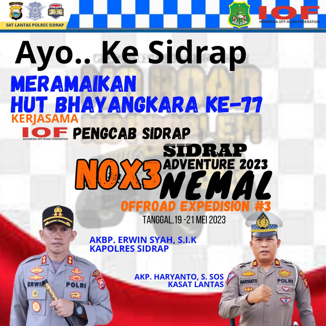 Kapolres Sidrap AKBP Erwin Syah,S.I.K mengatakan bahwa, dengan kegiatan ini, Polres Sidrap dan Panitia kegiatan Off Road mengundang bapak Kapolda Sulsel Irjen Pol. Drs. Setyo Boedi Moempoeni Harso, SH., M.Hum untuk menghadiri sekaligus melepas peserta Nox Sidrap Adventure 2023 Nemal Offroad Xpedition #3.