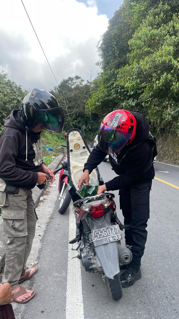 Peduli, Dua Personil Sat Samapta Polres Bener Meriah Membantu Pengendara Sepeda Motor Yang Kehabisan Bahan Bakar