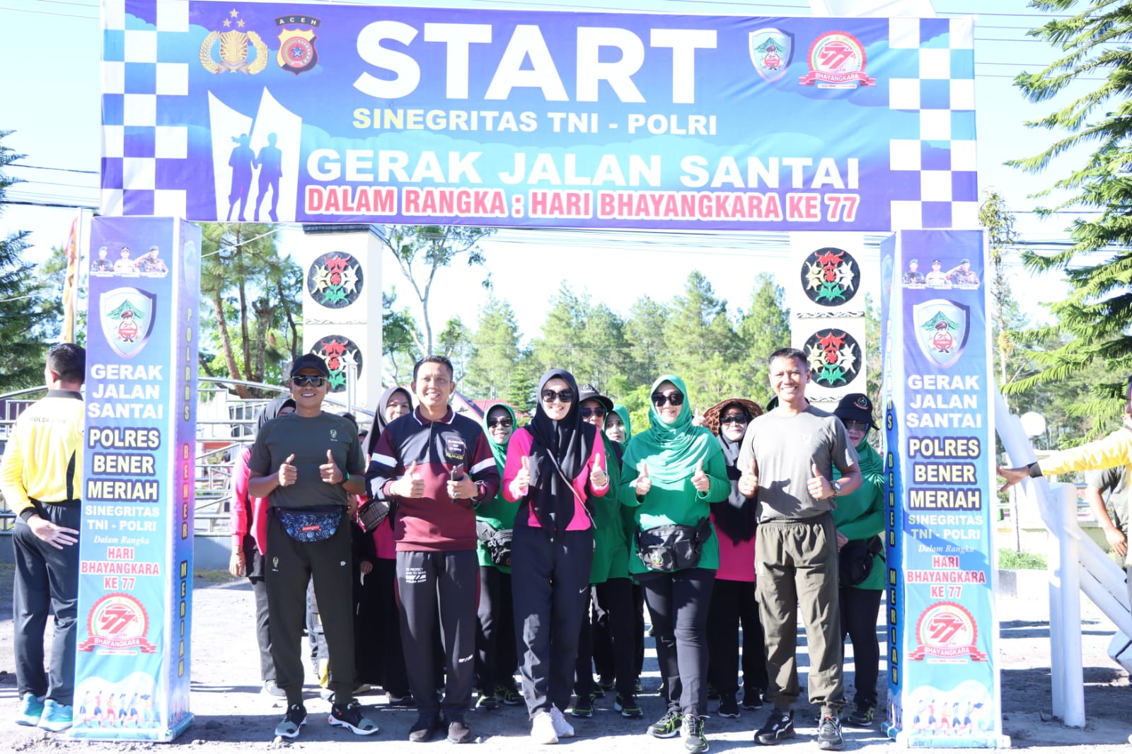 Redelong- Dalam rangka hari Bhayangkara ke 77, Kepolisian Resor Bener Meriah menggelar olah raga bersama TNI-Polri dalam rangka mempererat sinergitas dan tali silaturahmi, Sabtu (27/5/23).