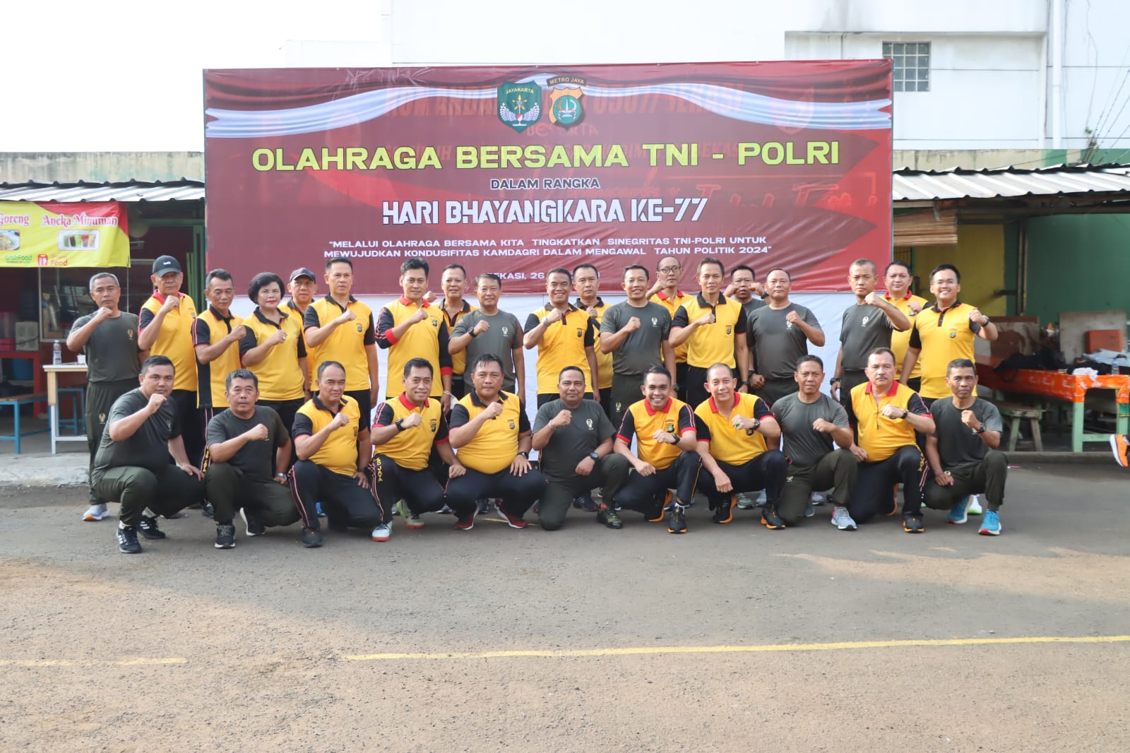 KeizalinNews.com Bekasi — Dalam rangka menjelang HUT Bhayangkara ke – 77 dan meningkatkan sinergitas TNI-POLRI, Polres Metro Bekasi Kota bersama Kodim 0507/Bekasi menggelar olah raga bersama dilapangan lapangan Apel Makodim 0507/Bekasi di Jln. Sudirman, Kranji, Bekasi Barat, Jumat (26/5/2023).