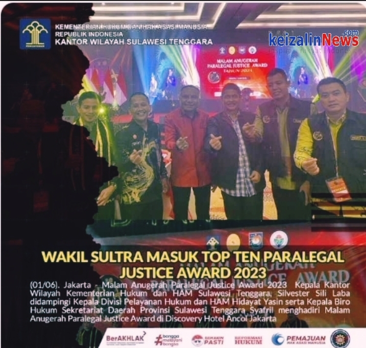 Keizalinnews.Com – Jakarta – Malam Anugerah Paralegal Justice Award 2023 Kepala Kantor Wilayah Kementerian Hukum dan HAM Sulawesi Tenggara, Silvester Sili Laba didampingi Kepala Divisi Pelayanan Hukum dan HAM Hidayat Yasin serta Kepala Biro Hukum Sekretariat Daerah Provinsi Sulawesi Tenggara Syafril menghadiri Malam Anugerah Paralegal Justice Award di Discovery Hotel Ancol Jakarta