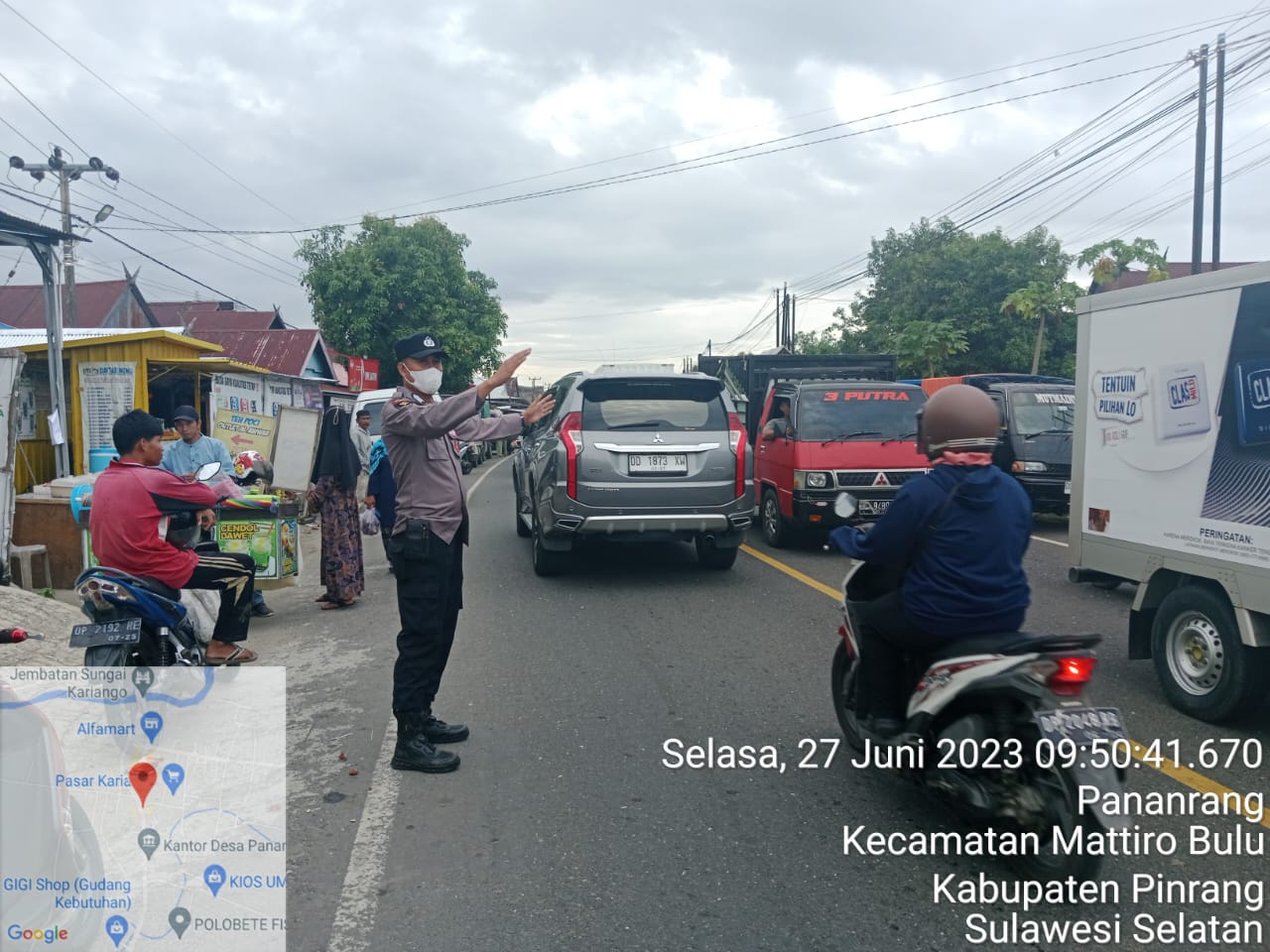 KeizalinNews.Com, Pinrang (Sulsel) – Bhabinkamtibmas Pananrang polsek Mattiro Sompe polres pinrang, Aipda Aipda Ary Pamulyo melaksanakan kegiatan DDS dan pengaturan arus lalin depan Pasar Kariango desa pananrang, guna mencegah terjadinya kemacetan depan pasar Kariango. Selasa(27/06/2023)