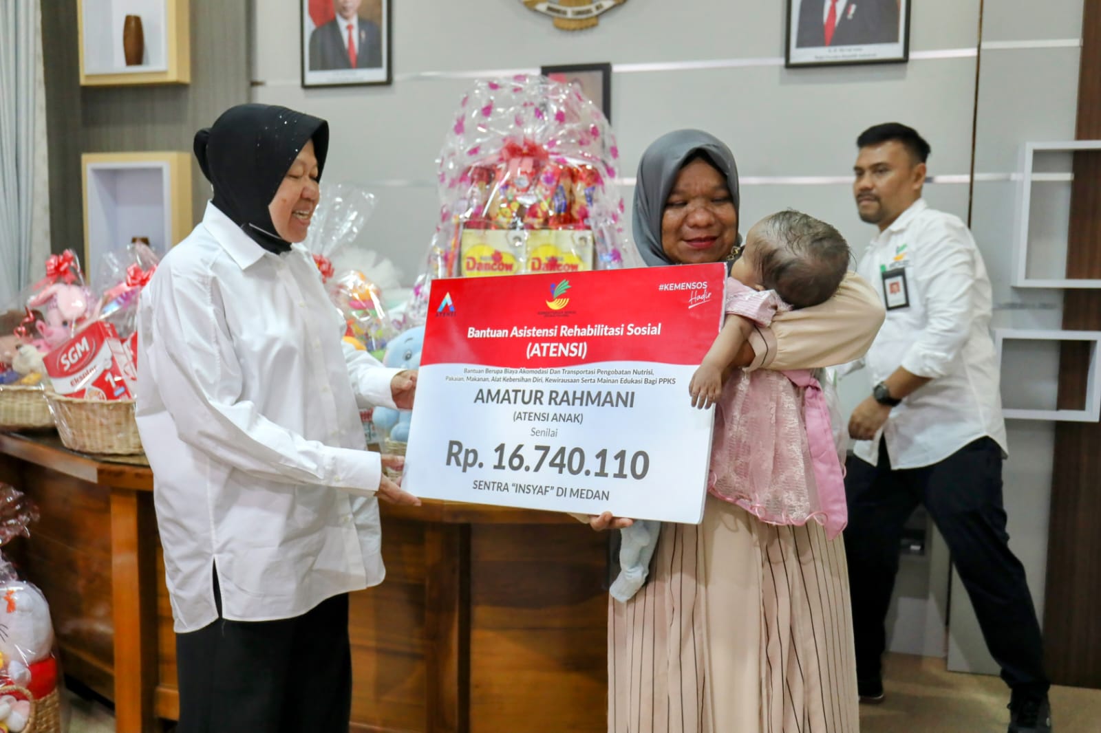 Menteri Sosial RI Tri Rismaharini memberikan bantuan Asistensi Rehabilitasi Sosial (Atensi) dan menyaksikan pemberian bantuan donasi kitabisa.com kepada 2 (dua) orang anak penderita Atresia Ani dan Jantung Bocor, bertempat di Sentra Darussa’adah Aceh.