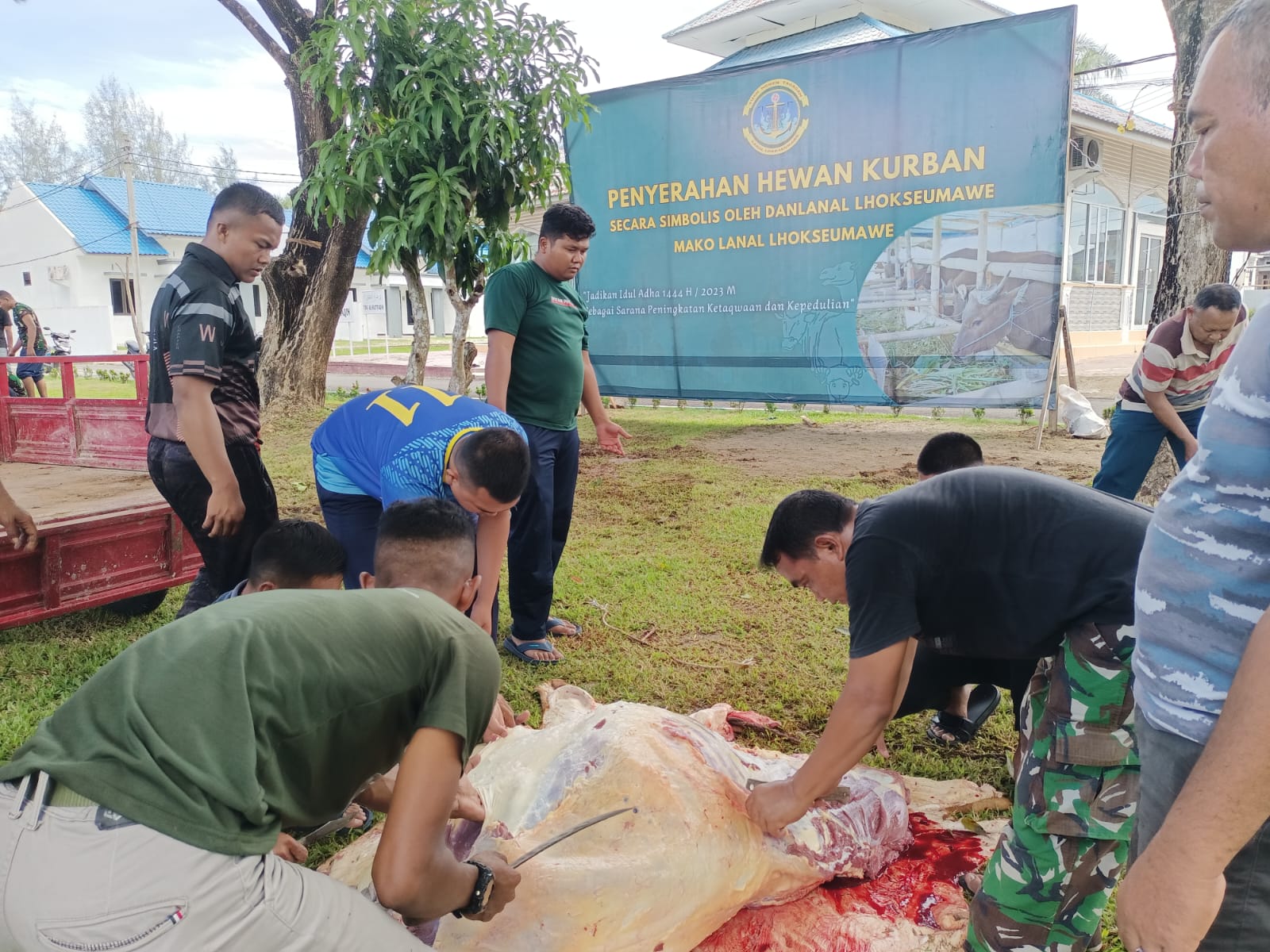Penyembelihan hewan Qurban tersebut dalam rangka memperingati Hari Raya Idul Adha 1444 H/2023 M. Penyembelihan dan pembagian hewan Qurban berupa 4 ekor sapi dan 1 ekor kambing. Daging Qurban tersebut disalurkan secara simbolis kepada masyarakat sekitar Mako Lanal Lhokseumawe.