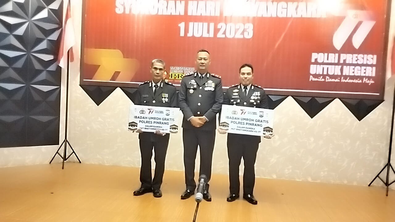 KeizalinNews.Com, PINRANG (Sulsel) –Sebagai wujud ungkapan rasa syukur pada HUT ke-77 Bhayangkara, Polres Pinrang menggelar Syukuran dengan melakukan berbagai kegiatan salah satunya dengan memberikan beberapa hadiah bagi para juara lomba HUT bhayangkara bagi masyarakat maupun internal Polres Pinrang dan hadiah umroh bagi anggota polres Pinrang, Sabtu (1/7/23).