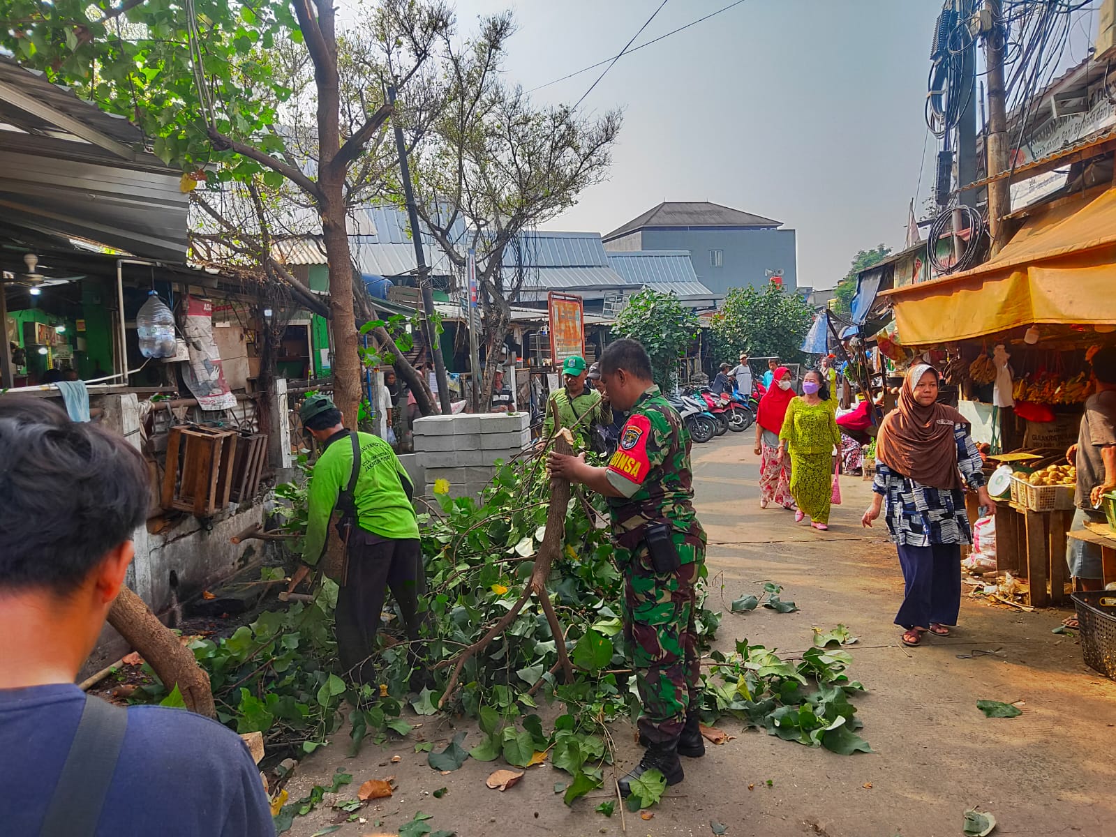 KeizalinNews.com Jakarta Pusat — Babinsa Kel. Galur Koramil 08/JB Kodim 0501/JP Serka Agus Rajikan melaksanakan kegiatan penopingan pohon bersama warga dan PPSU di sepanjang Jl. Kwista RW 07 Kel. Galur, Johar Baru Jakarta Pusat. Jumat (7/7/2023).