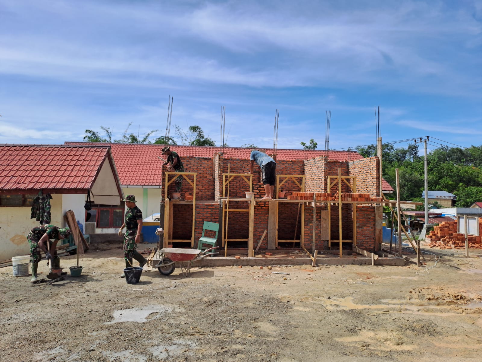 Dalam pembangunan sarana MCK tersebut Satgas TMMD telah selesai melakukan pemasangan kusen pintu yang dilanjutkan ketahap penyambungan bata dinding bangunan.