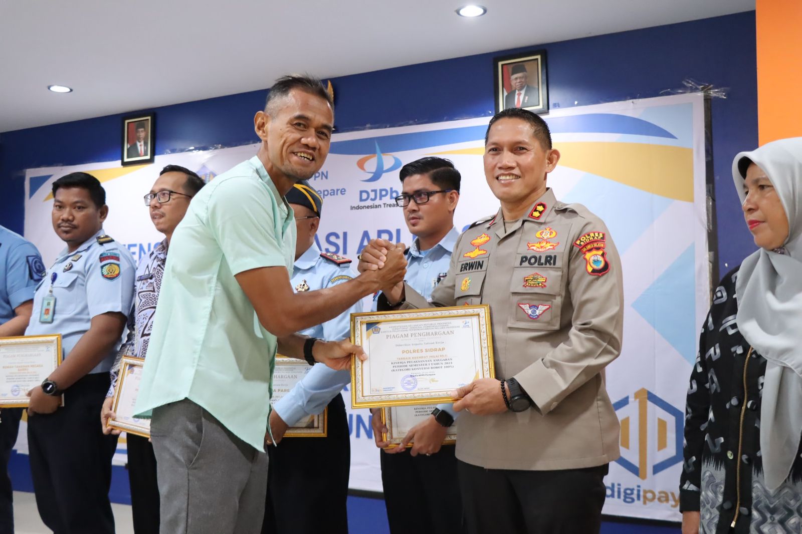 Piagam penghargaan dari Kantor Pelayanan Perbendaharaan Negara diterima langsung oleh Kapolres Sidrap AKBP Erwin Syah,S.I.K dari Kepala KPPN kota Pare-Pare, Kamis (27/07/2023).