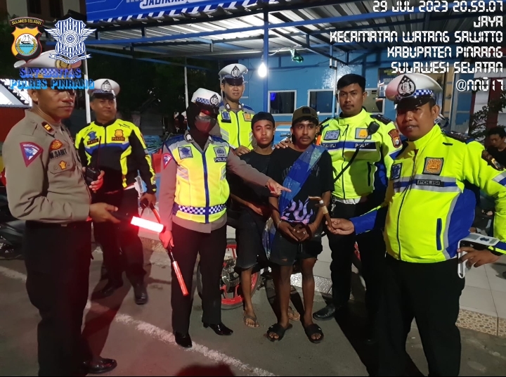 AKP Agussalim kata dia, benar pak tadi personil Satlantas Polres Pinrang pada unit Turjawali yang melakukan patroli blue light berhasil menjaring dua orang pemuda yang berboncengan karena gerak geriknya mencurigakan dan tidak menggunakan alat pelindung diri jenis helm.”