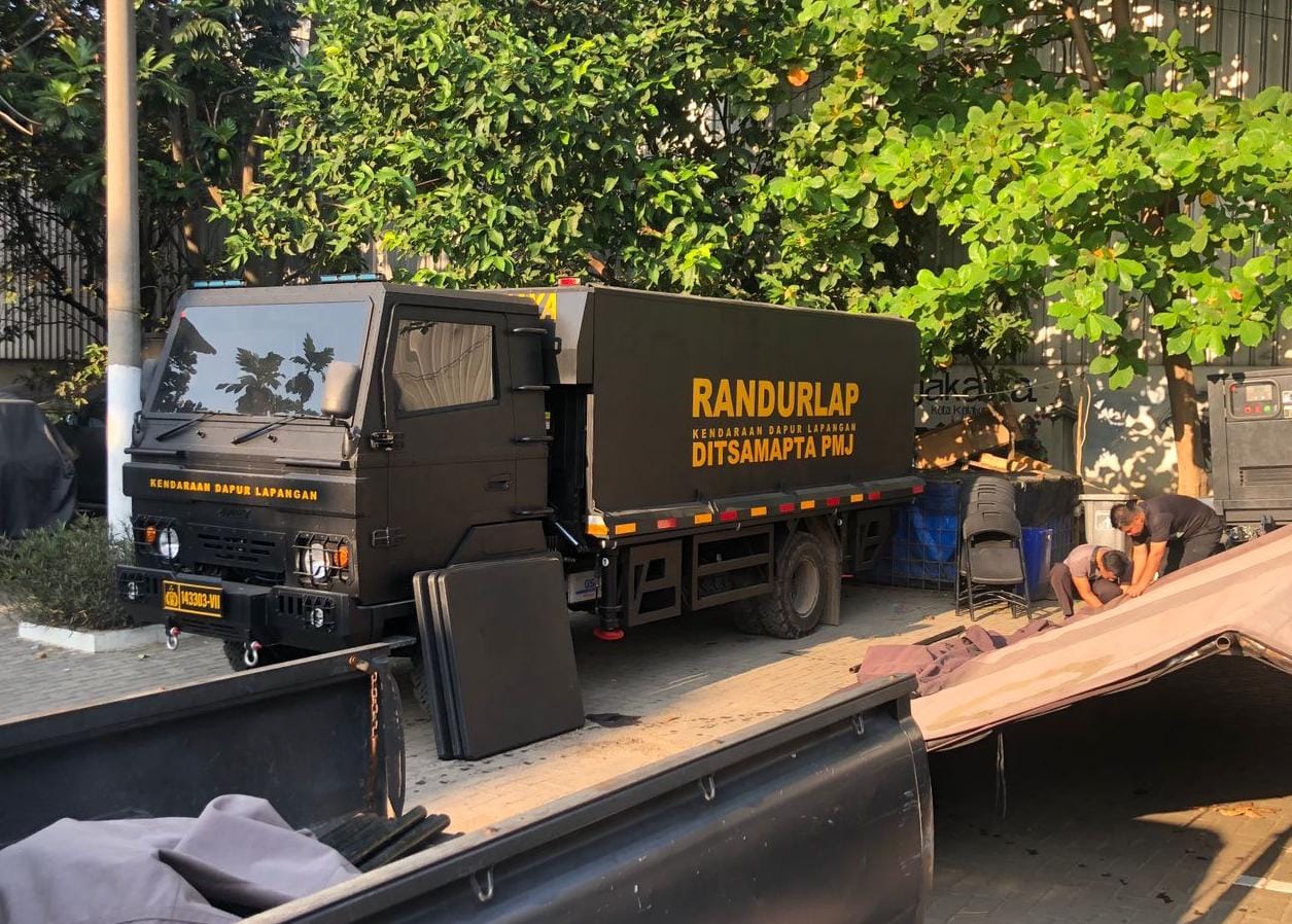 KeizalinNews.com Jakarta — Personel Brimob dan Samapta Polda Metro Jaya diterjunkan guna membantu menyiapkan dapur umum bagi korban kebakaran yang saat ini tinggal di tenda-tenda pengungsian di Kapuk Muara, Penjaringan, Jakarta Utara, Senin (31/7/2023).