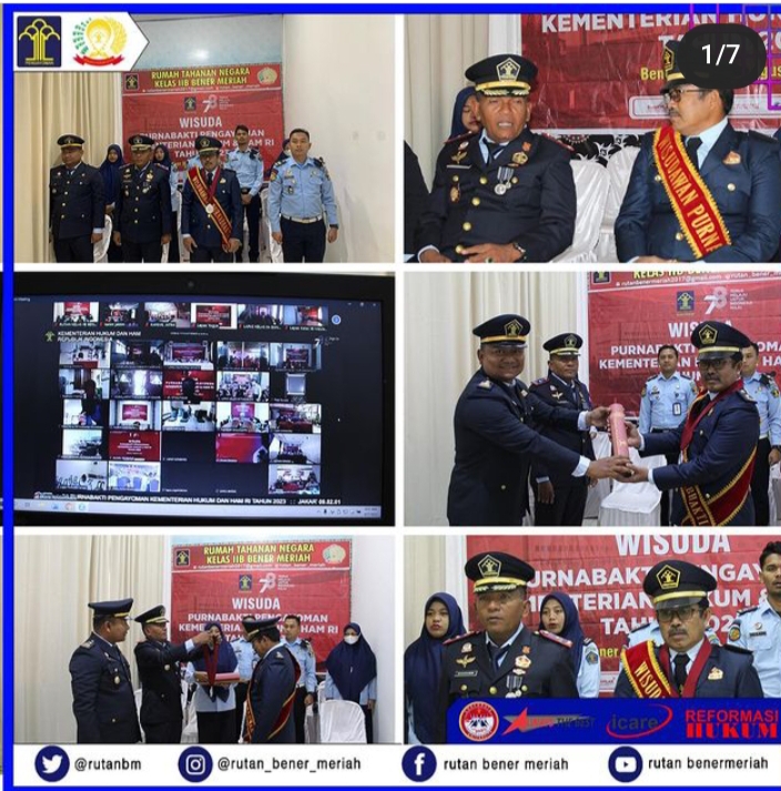 Keizalinnews.com|BENER MERIAH- Pengawal di lingkungan Kementrian Hukum dan hak asasi manusia (Kemenkumham) yang memasuki masa Pumabakti periode1 September 2022 Sampai dengan 1 Agustus 2023 mengikuti Acara wisuda Purnabakti Pengayoman Kementrian Hukum dan HAM RI Senen 07/08/2023.