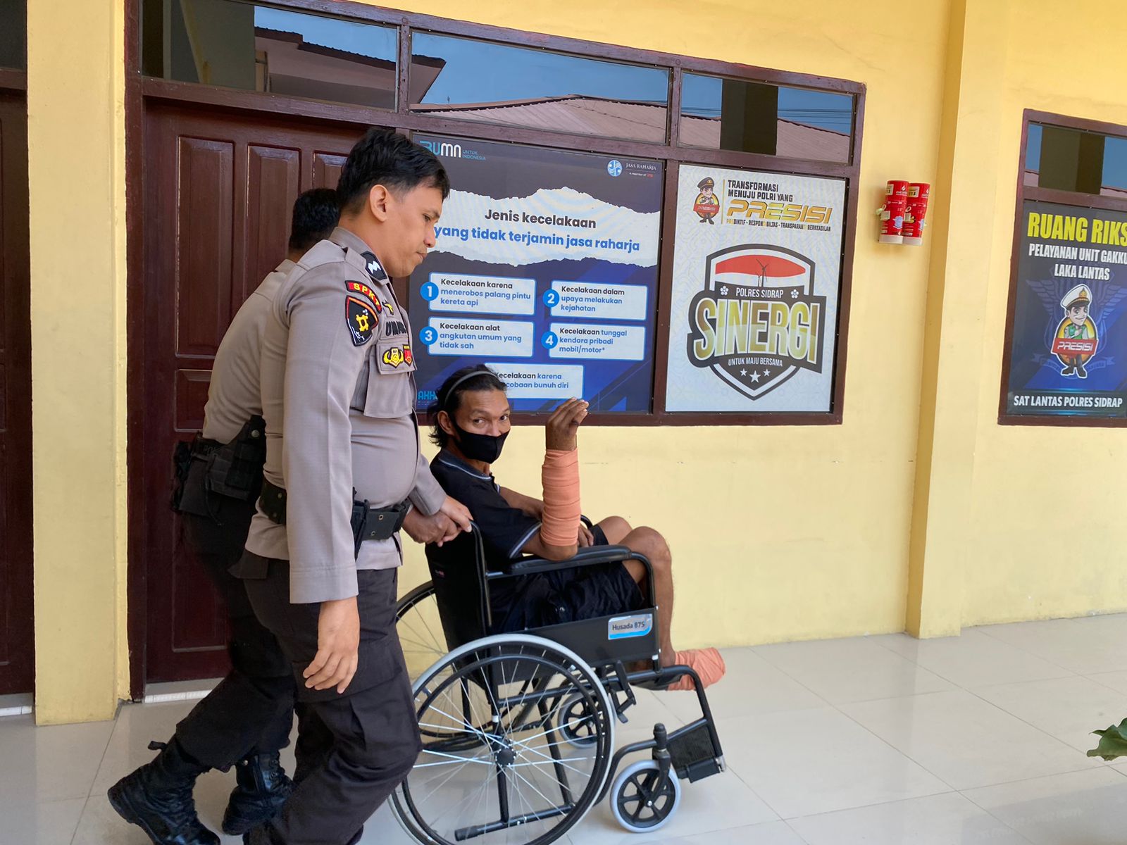 Kanit SPK III SPKT Polres Sidrap AIPDA Umar. SH bersama AIPTU Haeruddin pun langsung mendorong kursi roda. Mereka mengantarkan lelaki tersebut menuju ke ruang unit laka lantas Polres Sidrap