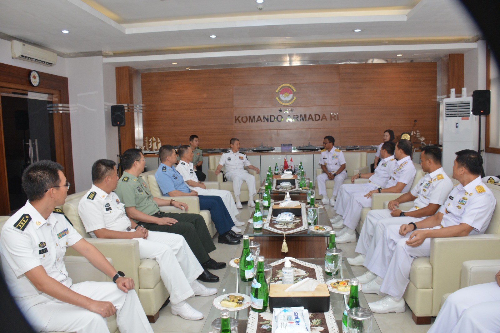 KeizalinNews.com Jakarta — Kepala Staf Koarmada Republik Indonesia (Kaskoarmada RI) Laksda TNI Didong Rio Duta, yang mewakili Panglima Komando Koarmada Republik Indonesia (Pangkoarmada RI) Laksdya TNI Heru Kusmanto menerima kunjungan Wakil Panglima Komando Satuan Perang Wilayah Selatan Angkatan Bersenjata China Laksamana Madya Wei Wenhui, bertempat di ruang VIP Panglima, Mako Koarmada RI, Jakarta, Jumat 20 Oktober 2023.