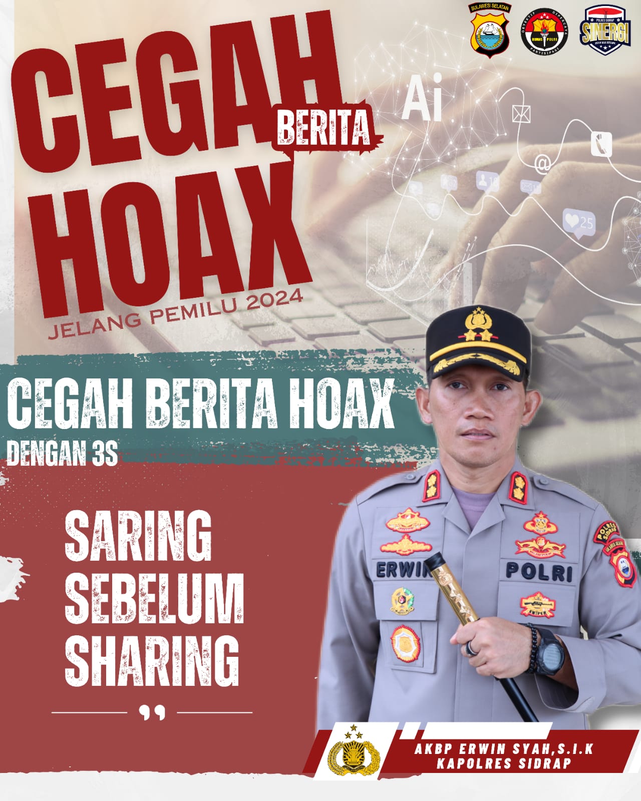 Oleh karena itu, Kapolres Sidrap AKBP Erwin Syah SIK menyoroti pentingnya pencegahan berita hoax, terutama menjelang Pemilu 2024.Rabu (25/10/2023).