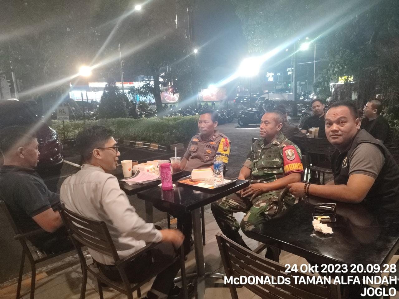 Keizalinnews Kodam Jaya Jakarta-Babinsa Koramil 07/KB Kel Joglo Serka Mustaqim bersama Bimas melaksanakan monitoring Siskamling/ PAM Swakarsa di wilayah bersama security pos Mc donals Jl.Joglo Raya Rt 08/03 Kel. Joglo Kec Kembangan Jakarta Barat.selasa (24/10/2023) malam.