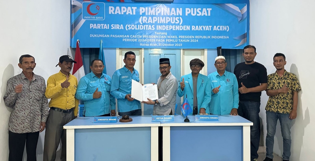 Banda Aceh Kezalinnews.com Rapat Pimpinan Pusat (RAPIM) Partai SIRA yang dipimpin langsung oleh Majelis Tinggi Partai (MTP) dan Dewan Pimpinan Pusat (DPP) Partai SIRA memutuskan akan mendukung pasangan Capres-Cawapres Anies Baswedan dan Muhaimin Iskandar (AMIN), hari ini, Selasa, 31 Oktober 2023 di Banda Aceh.
