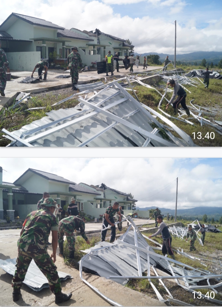 plapon dan atap terangkat angin puting beliun sehingga Prajurit Kodim 0119/BM secara bersama-sama melaksanakan pembersihan” Sabtu 18 November 2023.