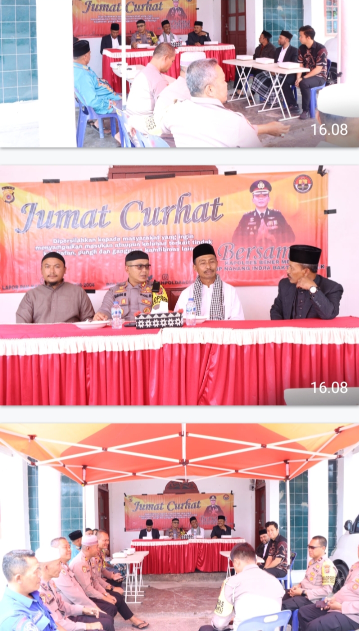 Kapolres Bener Meriah AKBP Nanang Indra Bakti, SH, SIK mengatakan, Jum’at Curhat ini merupakan salah satu program gagasan Kapolda Aceh yang dilaksanakan oleh seluruh Polres jajaran Polda Aceh khususnya Polres Bener Meriah. Hal ini bertujuan agar masyarakat dapat menyampaikan secara langsung tentang pendapat, keluhan dan saran kepada Polri.