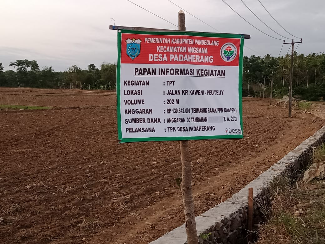 Tertulis di Papan Informasi Proyek Pembangunan Tembok penahan tanah (TPT) yang berlokasi dijalan kampung kaweni-Peuteuy dengan anggaran Rp 139 Juta, bersumber dari Anggaran Tambahan Dana Desa anggaran 2023 yang dikerjakan TPK Desa Padaherang.