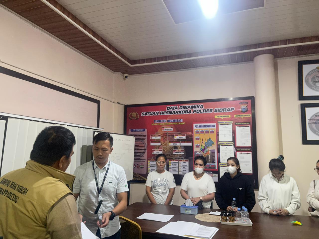 Turut hadir dalam kegiatan asesmen Ps. Kasat Res Narkoba Polres Sidrap IPTU M. Patria Pratama, S.Tr.K, Dokter Puskesmas Pangkajene dr. Rosmin, Staf kementerian sosial Ibu Fitri, Kepala KBN Mappadeceng Iwan Darmawan, SE, Orangtua / wali Pecandu yang terjaring razia