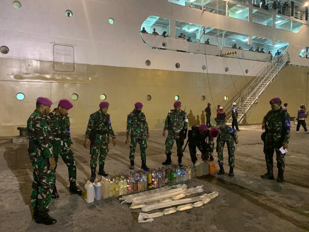 KeizalinNews.com Jakarta — Prajurit TNI Angkatan Laut (TNI AL) dalam hal ini Batalyon Marinir Pertahanan Pangkalan (Yonmarhanlan) IX Ambon yang bertugas dalam Tim Satgas Pelni Ambon berhasil mengamankan ratusan liter Minuman Keras (Miras) tradisional jenis Sopi tanpa izin dari para penumpang KM Ceremai di Pelabuhan Tulehu, Ambon, Maluku, Senin (01/01/24).