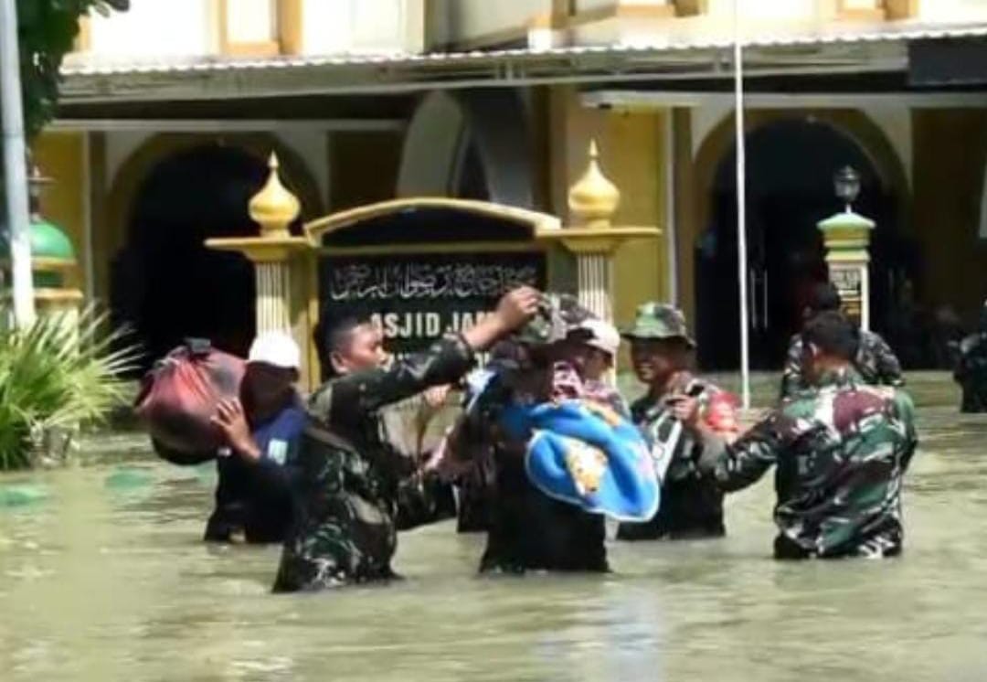KeizalinNews.com Demak — Dandim 0716/Demak Letkol Kav Maryoto bersama 100 personelnya melaksanakan evakuasi dan SAR bagi warga yang terdampak banjir akibat jebolnya beberapa tanggul sungai di wilayah Kecamatan Gajah dan Karanganyar, Kabupaten Demak, Sabtu (10/2/2024).