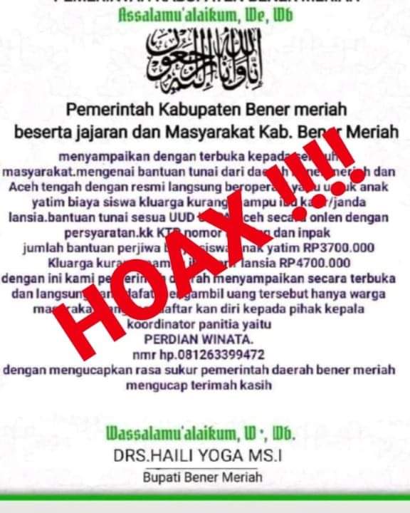 Saya harap masyarakat tidak percaya dengan postingan yang beredar di media sosial yang mengatasnamakan Pj. Bupati Bener Meriah Drs. Haili Yoga, M.Si. karena pemberitahuan yang beredar di dunia sosial tersebut adalah penipuan yang di lakukan oleh orang yang tidak bertanggung jawab untuk menguntungkan diri sendiri, untuk itu sekali lagi kami sampaikan agar masyarkat untuk tidak menanggapi dan mempercayainya,” pinta Kabag Protokol dan Komunikasi Pimpinan Setdakab Bener Meriah itu.