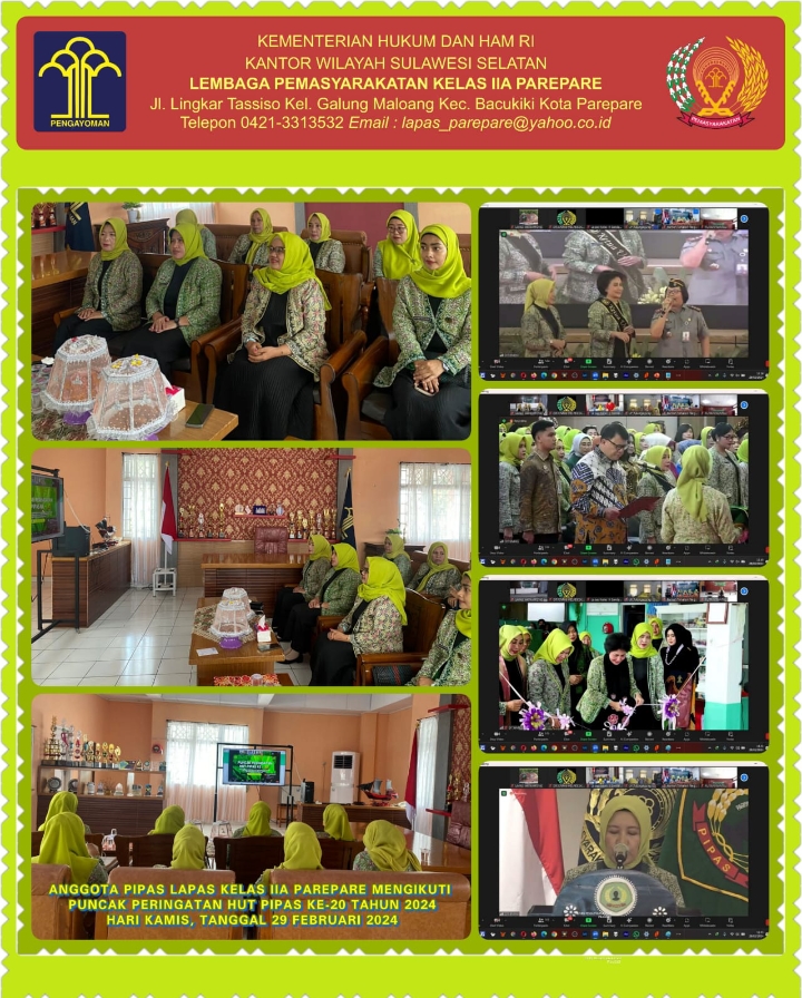 KeizalinNews.com, Parepare (Sulsel)–Semarak Puncak Peringatan Hari Ulang Tahun PIPAS Ke-20 Tahun 2024 secara virtual atau daring yang diselenggarakan oleh PIPAS Pusat bertempat di Graha Bhakti Pemasyarakatan Direktorat Jenderal Pemasyarakatan di Jakarta Pusat dan diikuti baik secara langsung maupun daring oleh seluruh PIPAS Daerah di seluruh Indonesia, Kamis, (29/2/2024).
