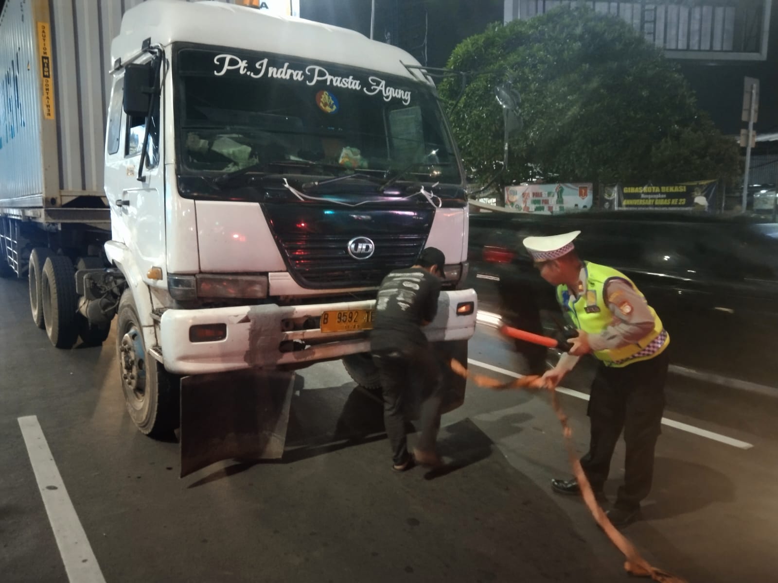 Kedua anggota Satlantas Polres Polres Metro Bekasi Kota kemudian melaksanakan gatur lalin akibat dari proses evakuasi truck. Untuk evakuasi, Petugas meminta bantuan truck lain yang kapasitas mesin besar untuk melakukan penarikan menggunaka kabel seling.