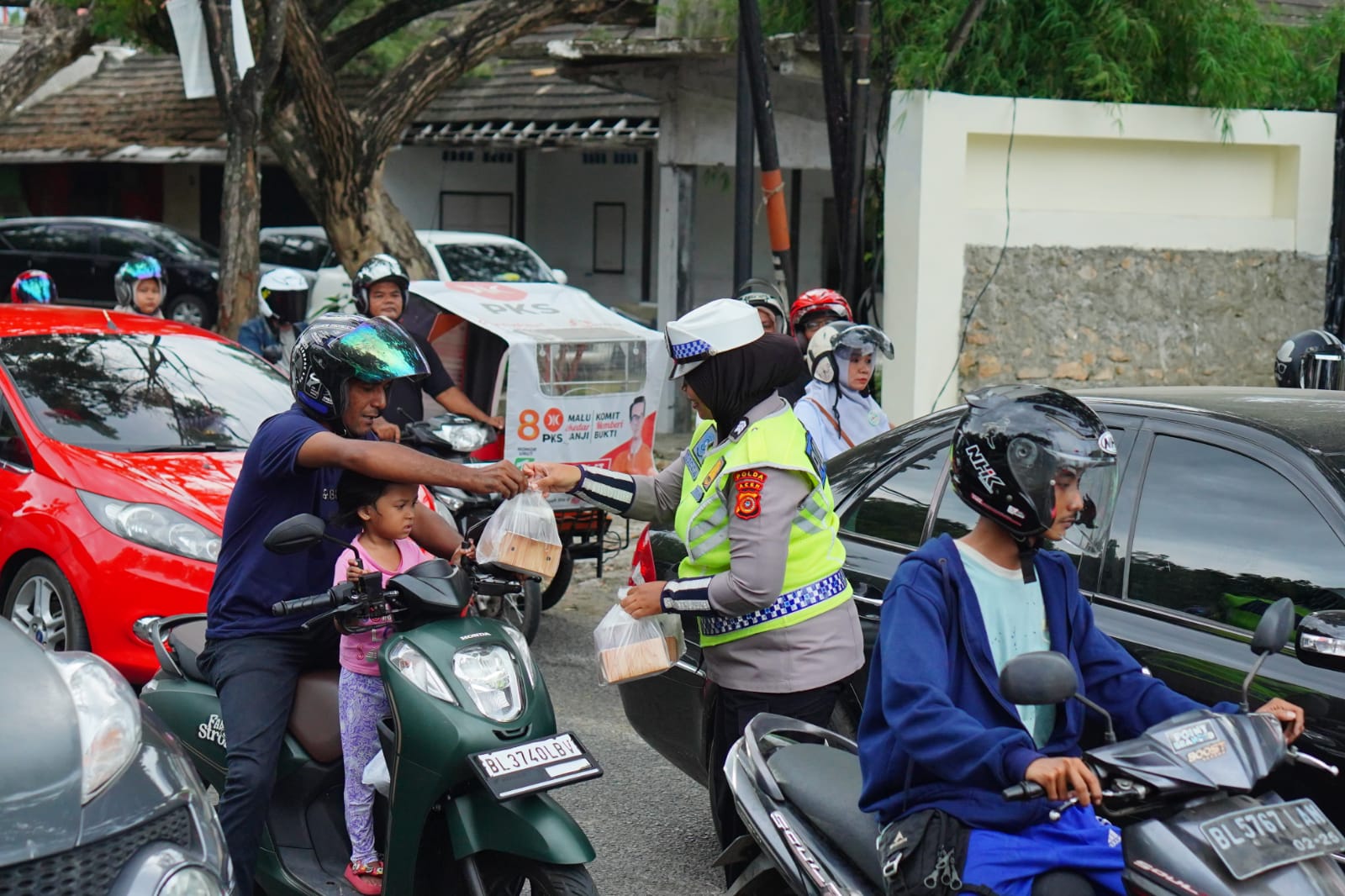 Keizalinnews.com| Banda aceh-: Direktorat Lalu Lintas (Ditlantas) Polda Aceh membagikan takjil berbuka puasa bagi pengendara yang melintas di seputaran Simpang Tugu, Kota Banda Aceh, Senin, 18 Maret 2024.
