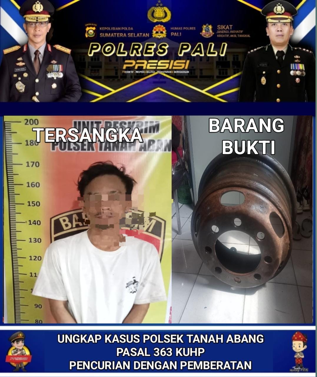 “Velg mobil Fuso yang dicuri berhasil ditemukan dan diamankan sebagai barang bukti. Selanjutnya, pelaku dan barang bukti dibawa ke kantor Polsek Tanah Abang untuk proses lebih lanjut,” ucapnya ke awak media Sabtu (23/03/2024).