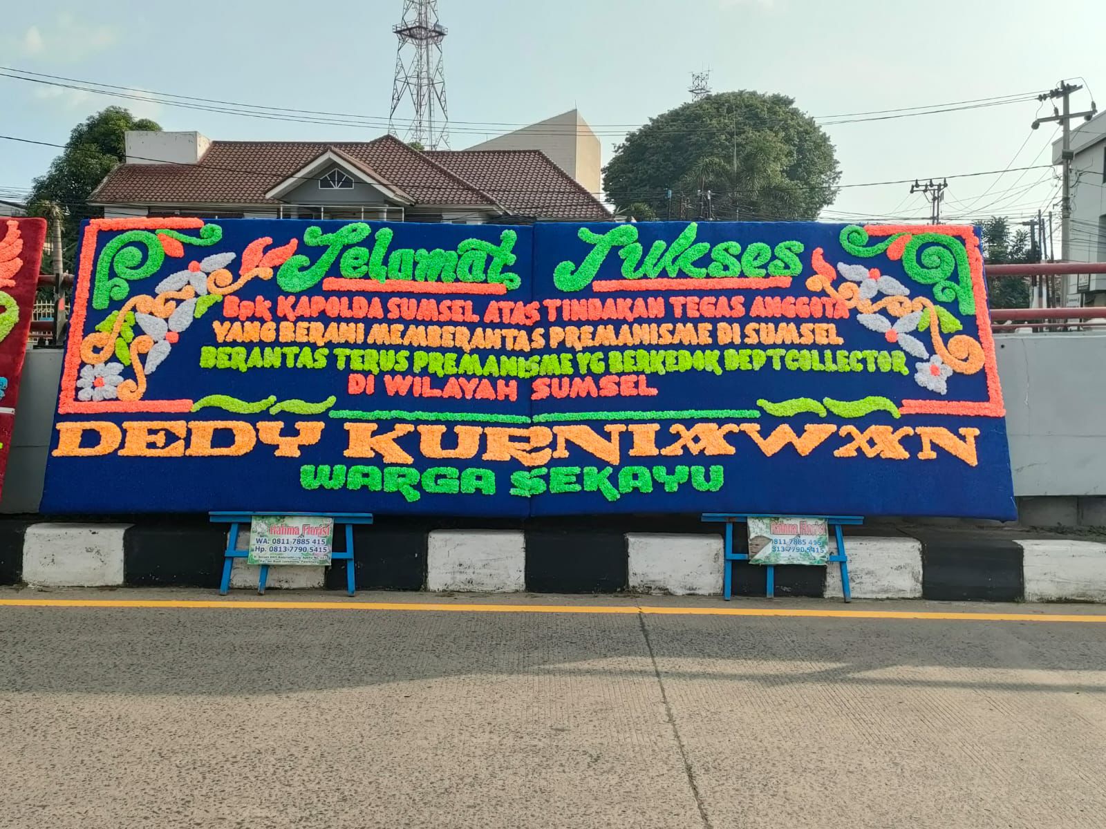 “Kami mendukung Pak Kapolda untuk membasmi debt collector yang meresahkan Sumsel. Polisi tidak boleh kalah sama preman,” tulis salah satu karangan bunga yang dikirim Pemuda Banyuasin.