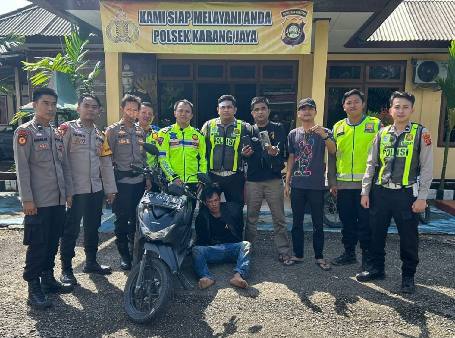 “Tak membung kesempatan, Ipda Benny Pratama bersama Bripda Riyando mengejar pelaku menggunakan sepeda motor, empat petugas lainnya menggunakan kendaraan roda empat. Sesampainya di simpang Karang Jaya, diduga pelaku tidak menguasai kendaraannya sehingga tergelincir dan jatuh. Tqk mau menyerah, pelaku justru melarikan diri ke perkampungan warga. Petugaspun berhasil mengamankan salah satu pelaku berinisial
