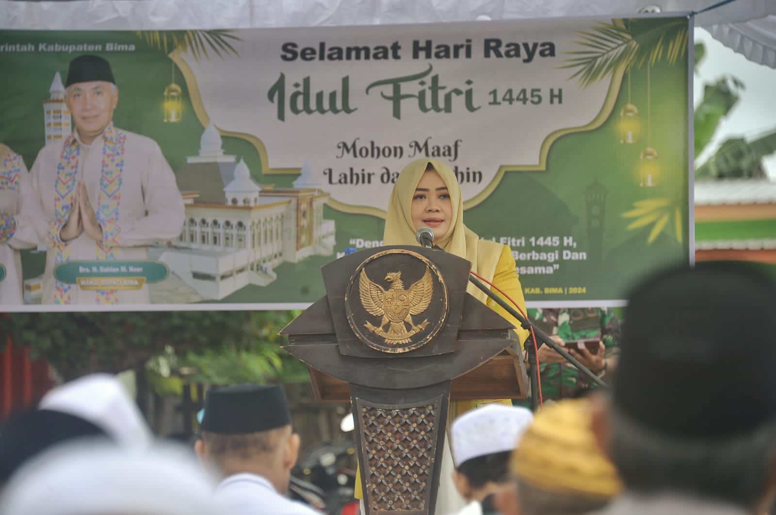 KeizalinNews-comKabupaten Bima. Pelaksanaan Shalat Idul Fitri 1 syawal 1445 Hijriyah jajaran Pemerintah Kabupaten Bima dengan masyarakat Kecamatan Bolo dan sekitarnya yang berlangsung Rabu 10 April 2024 dimanfaatkan Bupati Bima Hj. Indah Dhamayanti Putri, SE.M.IP untuk kembali menekankan pentingnya berbagi khususnya dengan warga yang tidak berkecukupan.