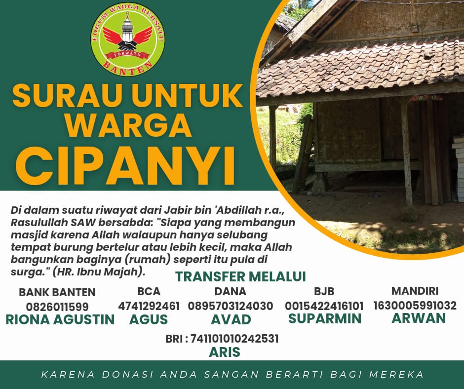 “Saya siapkan Aksi Gotong Royong Bangun Surau untuk Warga Cipanyi, dan segera kumpulkan dana awal untuk dibawa pada Rabu 17 April 2024 ke Cipanyi sebagai stimulus bantuan awal untuk ketuk hati para donatur di wilayah Lebak khususnya Banten dan Nasional umumnya. Ada beberapa Tokoh di FORWATU BANTEN juga sudah menyampaikan kepada BAZNAS baik di Kabupaten Lebak maupun Banten. Salah satunya H Akhmad Jajuli tokoh Banten yang dengan responsif nya menyampaikan ke Pihak BAZNAS Banten karena ketokohannya pihak BAZNAS berjanji akan membantu juga ada Sekretaris FORWATU BANTEN Imdad yang berkomunikasi dengan Pihak BAZNAS Lebak juga karena ketokohannya ia didengar dan BAZNAS Lebak akan membantu dengan prosedur Proposal yang diajukan!” Papar Arwan.