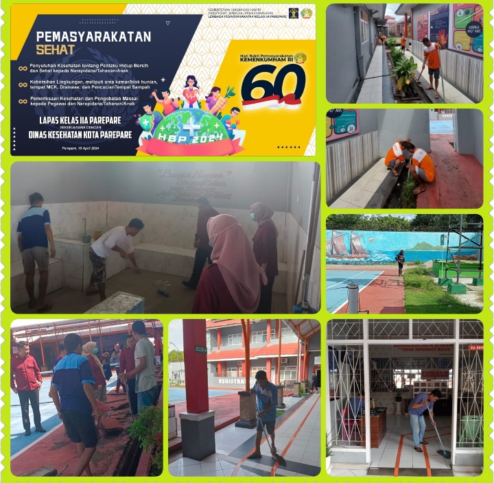 KeizalinNews.Com, Parepare (Sulsel)–Bertempat di Lapas IIA Parepare seluruh petugas bersama warga binaan melaksanakan kegiatan Kerja Bhakti membersihkan lingkungan sekitar dalam rangka memperingati Hari BHAKTI PEMASYARAKATAN Ke-60 Tahun 2024, Kamis, (18/4/2024).