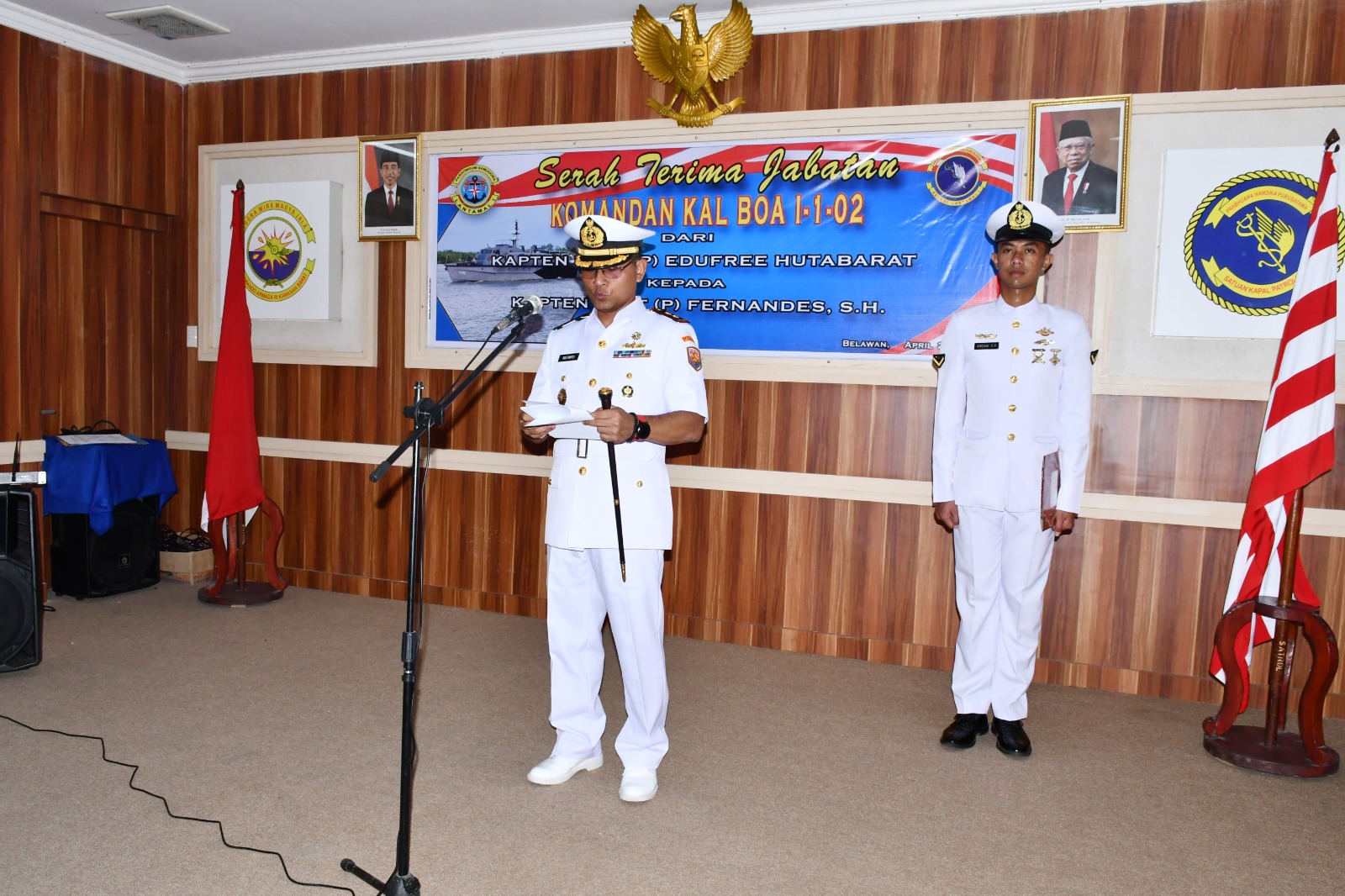 Dansatrol Lantamal I dalam amanatnya menyampaikan ucapan terima kasih dan penghargaan atas kerja sama dan pengabdiannya kepada Kapten Laut (P) Edufree Hutabarat, serta selamat bertugas di tempat yang baru, semoga dapat terus meraih kesuksesan. Ucapan selamat juga disampaikan kepada Komandan KAL BOA I-1-02 yang baru, Kapten Laut (P) Fernandes, S.H., atas kepercayaan yang diberikan oleh pemimpin TNI AL, pertahankan prestasi yang telah dirintis pendahulu, dan tingkatkan serta kembangkan kreatifitas dalam memberikan karya terbaik untuk TNI AL khususnya Lantamal I.